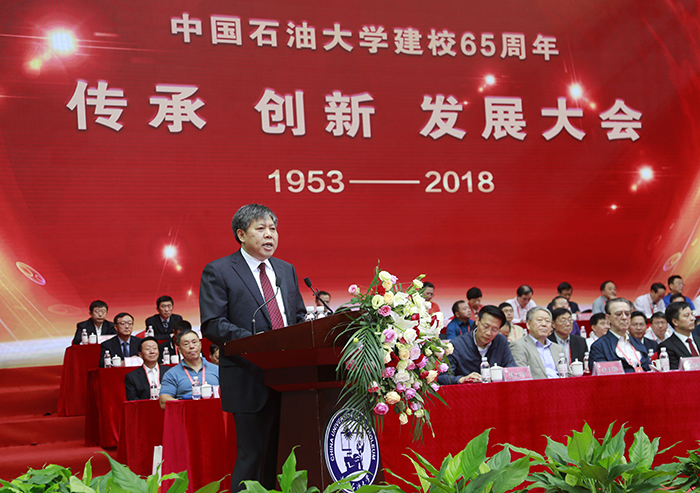 金秋时节的青岛,山高海阔,天朗气清。在这举国欢度国庆佳节的美好日子里,我们隆重举行中国石油大学建校65周年传承创新发展大会,回顾石大历史,传承石大精神,谋划创新发展。在这承前启后的喜庆时刻,我谨代表公司全体师生员工,对各位领导、各位嘉宾的光临表示最热烈的欢迎!向长期关心、支持公司建设和发展的各级领导、企事业单位、兄弟院校和社会各界朋友表示最衷心的感谢!向遍布世界各地和祖国四面八方的30余万名员工致以最诚挚的问候!