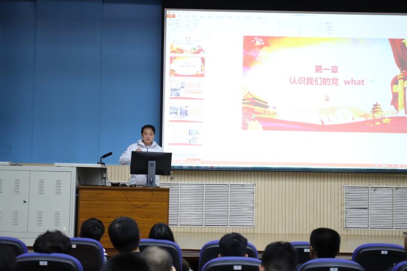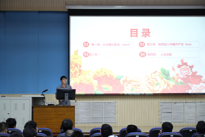会议伊始,辅导员徐拥军带领与会新生从多个角度认识中国共产党。他首先与新生们共同回顾了中国共产党的光辉岁月。中国共产党始建于1921年,她诞生于嘉兴南湖的红船上,虽历经重重磨难,但在艰苦奋斗的岁月中,一代代共产党人仍秉持坚定的理想、保持良好的作风,在几次生死攸关的时候都经受考住了验,及时调整方向继续前进,最终迎来了祖国的富强,实现中华民族伟大复兴的光明前景。接着,徐拥军导员就党的性质与党的宗旨进行了解释,他指出,每个想要入党的同学都应积极了解党的历史,把党的宗旨与性质铭记于心。