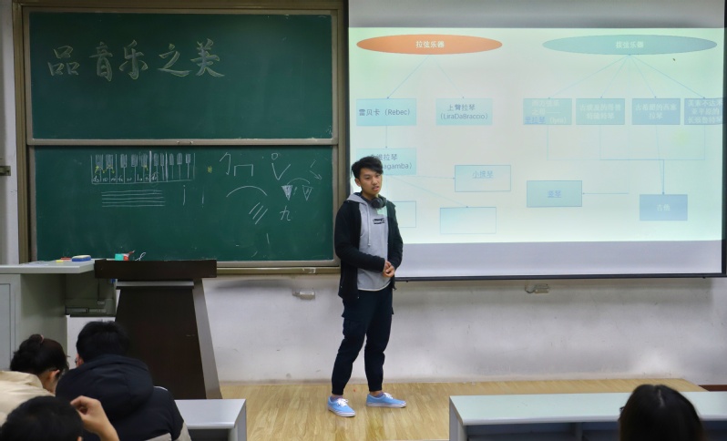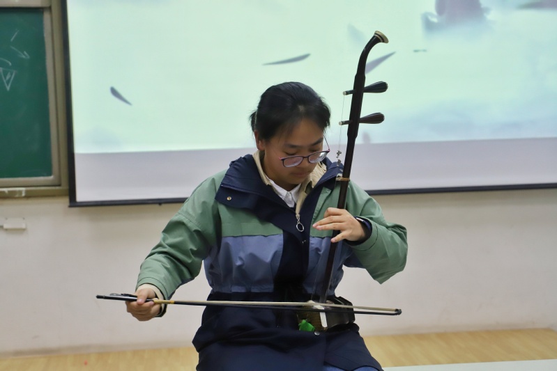 伴随着钢琴曲《李斯特的钟》的旋律,活动拉开帷幕。结合同学们日常生活中的疑惑,艺术团器乐队队长赵清锝对钢琴琴键、五线谱、交响乐队的组成等基本知识进行普及,并播放演奏视频使同学们更好的理解。器乐队成员姜博文对二胡的历史发展和构造进行介绍,激发了在场员工对传统民乐的兴趣。讲解期间邀请器乐队崔嘉智同学现场进行二胡演奏,与会同学在悠扬的旋律中被二胡的魅力吸引。“同学们对二胡常常有认识上的误区,二胡作为一种民族乐器,音色以悲著称,但其也有欢快的一面,如经典曲目《赛马》《奔驰在千里草原》。”姜博文如是说。李腾飞、李佳乐主要从乐器的分类和演变方面进行梳理,让同学们了解传统民乐的地位和影响以及其发明者的创造力。