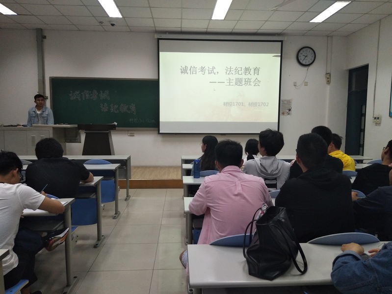 为帮助同学们树立诚信考试、文明做人的理念,以积极向上的状态迎接即将到来的期末考试,进一步规范考风考纪,5月18日晚九点,材控1701、1702班于南堂402教室召开了“诚信考试,法制教育”的主题班会。材控1702团支书巩敏主持本次班会。
