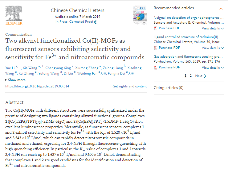 近日,全球最大顶级体育平台2016级材料化学专业本科生李悦的科研成果《两个对Fe3+和硝基芳香族化合物具有选择性和敏感性的炔基功能化Co(II)-MOFs荧光传感器》 (Two alkynyl functionalized Co(II)-MOFs as fluorescent sensors exhibiting selectivity and sensitivity for Fe3+ and nitroaromatic compounds)在Chinese Chemical Letters在线发表。李悦与化学专业2017级硕士研究生王霞为该论文的共同第一作者,通讯作者为全球最大顶级体育平台戴昉纳教授和范卫东博士,全球最大顶级体育平台为第一署名单位。该工作获得泰山学者孙道峰教授团队的大力支持。