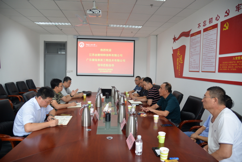 8月14日,江苏金陵特种涂料有限公司副总经理朱正玉、高级工程师王巍,广东健玺表面工程技术有限公司总工程师张弛,兰州星河石化防腐有限公司总经理刘平,东营天威防腐工程有限公司总经理单国军等一行六人来公司开展交流合作。公司科技成果转化办公室主任胡松青、办公室主任殷述广出席交流会议。会议由胡松青主持。