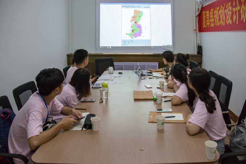 上午,为深入了解夏津县村庄规划现状,尤其是依托古桑资源发展的村镇规划相关信息,队员们来到夏津县规划研究中心,与负责相关规划项目的工作人员面对面交流。研究中心张主任与谭科长接待队员们。张主任与谭科长首先向队员们介绍夏津县基本情况,并就队员所提出的问题进行解答。其中,谭科长就桑产业中心所在地——苏留庄镇村庄规划进行详细讲解,并提供相关政策资料与规划方案。在交谈中,调研队了解到,以苏留庄镇为代表的夏津村镇结合黄河故道古桑文化产业开展的村庄规划工作不断完善改进,并逐步推进。