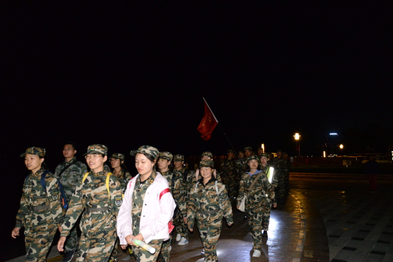 晚上十点半,全体新生整理好宿舍内务,身着迷彩服,肩负背包,在公司南门附近集合。各连排长清点完人数,向首长汇报准备就绪,拉练队伍按照规划路线从公司出发,沿唐岛湾畔,前往银沙滩附近。新生军训旅高度重视此次拉练,安排车辆全程跟随,各路口也安排了由教官和助教组成的警戒人员,确保整个活动平稳安全进行。在昏黄的路灯下,在安静的海岸边,新生们始终保持着整齐的队伍,井然有序地行进着,展示了材料院新生的良好风采。约凌晨两点,怀着兴奋与激动,队伍到达目的地,在唐岛湾滨海公园的广场上,新生们按照教官的指导与建议进行休息、整顿。同学们相互鼓励、帮助,在交流与歌唱中缓解疲倦与困意。经过简单休整后,同学们恢复来时的严肃有序,踏上归程。