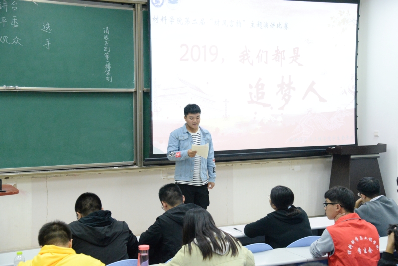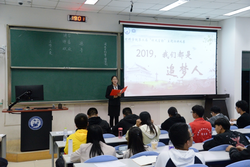 在材料1909班傅梦瑶的主持下,材料学子围绕青年、追梦、材料等关键词,依次上台进行演讲,阐述自己对奋斗和梦想的理解。来自材料类1901班的屈聪宇以电影《老男孩》的情节为例,表示现实是残酷的,但这不能成为梦想搁浅的理由。材料类1902班的选手姚梦鸽贯穿古今,谈到人格的各有所长和梦想的不分大小,呼吁同学们发挥自我优势,实现自身价值。“在这个属于奋斗者的时代,人人都是梦想的铸造者。我们必须务实担当,砥砺奋斗,勤学笃实,知行合一。”参赛选手贺艳萍说道。