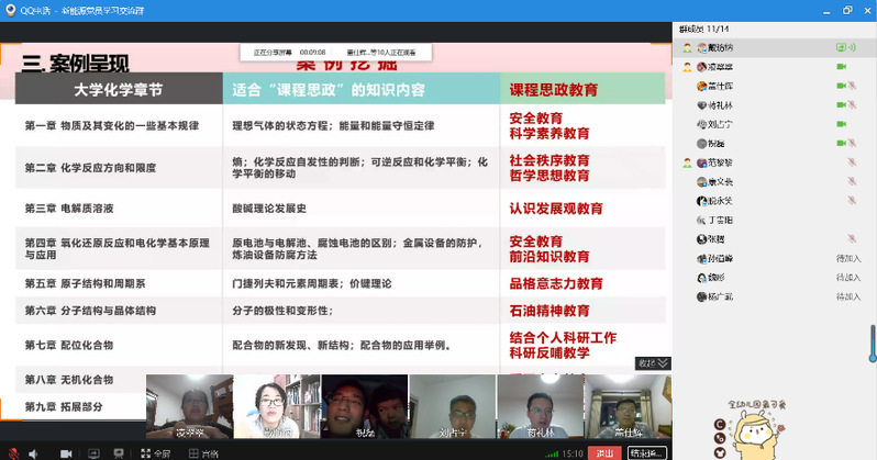 戴昉纳教授基于“三全育人”综合改革《大学化学》课程思政案例构建与实践做了精彩汇报。戴老师首先给大家阐述了课程思政和思政课程的概念,两者是隐性和显性思政的结合。对于课程思政主要从隐性思政出发潜移默化的教育员工不忘初心、牢记使命,不负韶华。根据“三全育人”的全员、全方位及全程教育理念和十大育人体系,《大学化学》课程从社会规则秩序、认识发展教育、品格意志力教育、爱国主义教育、安全意识教育、哲学辩证思想教育、科学素养教育等7个方面进行课程内容设计,探索课程思政实践。研究方法具有鲜明的特色,采用课程思政与公司石油行业“石油精神”、大学文化建设、关爱员工等相融合。努力将《大学化学》课程打造成承载“立德树人”使命的国家一流课程的同时,同时促进三全育人、促使本科生健康发展。