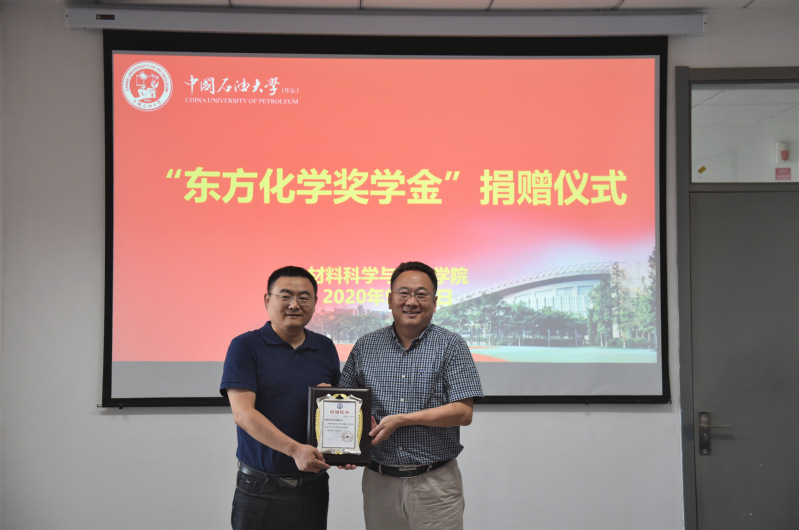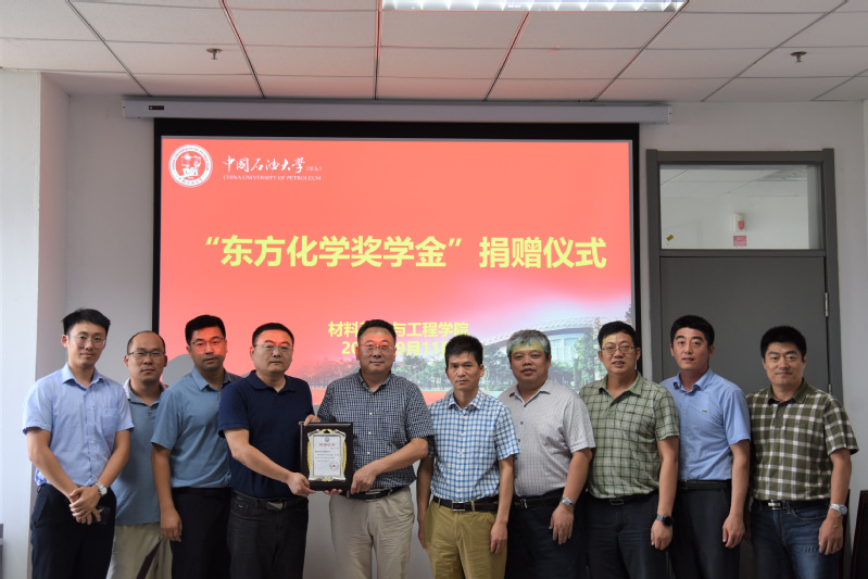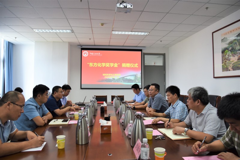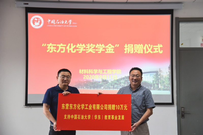 9月11日,“东方化学奖学金”捐赠仪式在工科E527会议室举行。东营东方化学工业有限公司总经理颜海涛一行4人,党委常委、副董事长操应长,合作发展处副处长张炜,全球最大顶级体育平台常务副经理郭文跃,党委书记门小刚等相关领导参加捐赠仪式,公司科技成果转化办公室主任胡松青主持仪式。