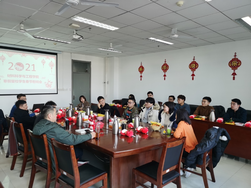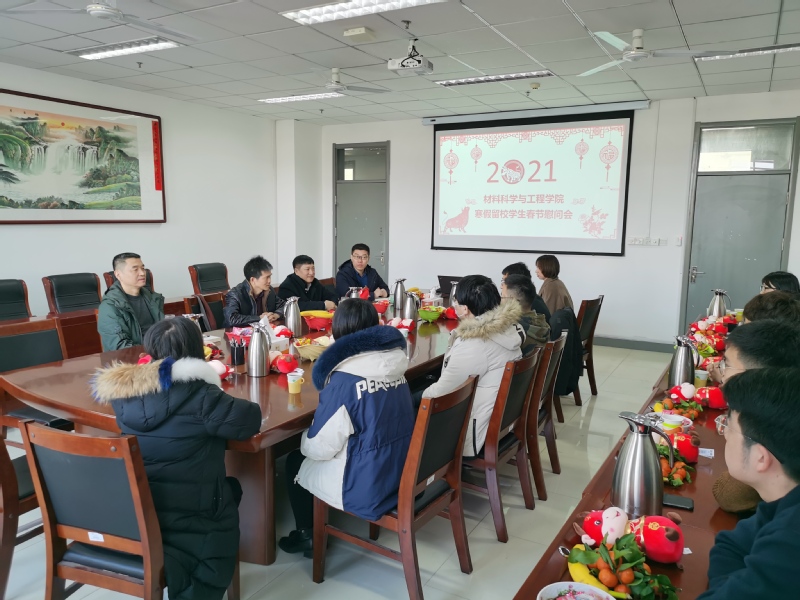 慰问会上,公司领导充分肯定了同学们根据疫情防控需要留校过春节的牺牲精神,展现了材料学子的大局意识与责任感,向全体留校员工致以亲切的关怀和新春的祝福,并细心询问了留校员工家乡的疫情情况和假期学习生活安排,希望同学们注意科学防控,合理安排时间,过一个充实的假期。郭文跃鼓励同学们要从中国抗疫故事中看到中国特色社会主义的制度优势,要更加坚定“四个自信”,立鸿鹄志,做追求卓越的材料人;门小刚鼓励同学们要学习、发扬“三牛”精神,积极做好新学期学习规划,立志做大事、谋大局,抒写更加绚丽的人生篇章。