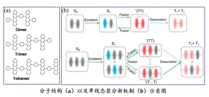 单线态裂分(singlet fission,SF)可以将一个高能量的单线态激子转换成两个低能量的三线态激子,从而实现光子的下转换,在提高有机太阳能电池的光电转化效率方面具有潜在的应用价值,成为近年来光电转换领域的新兴热点。