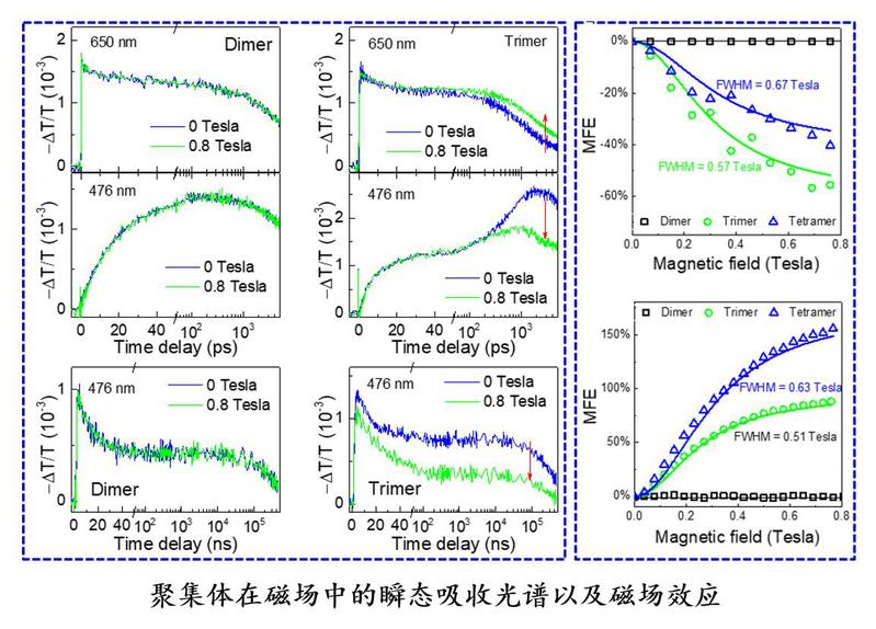 李希友教授团队提出通过为三线态的扩散提供空间来提高长寿命三线态量子产率的假设,设计合成了系列并四苯聚集体,并在四聚体中取得了高效率的长寿命三线态的量子产率(128%)(Org. Lett., 2017, 19, 580-583; J. Mater. Chem. C,2018, 6, 3245-3253),是当时报道的并四苯体系在溶液中取得的最高效率。近日,在前期工作基础之上,该团队与南京大学张春峰教授团队合作并借助其磁场中瞬态吸收和荧光技术对聚集体中的SF过程进行了深入的研究,阐明了SF过程中三线态对(1(TT))的分离机制,并印证了起初的设计思想,为设计具有实际应用价值的长寿命三线态的SF材料提供了新思路(Nat. Chem., 2021, DOI:10.1038/s41557-021-00665-7)。