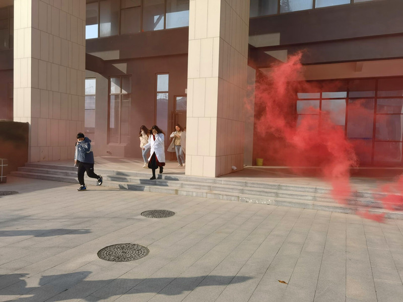 上午9:30,模拟新能源大厦发生火灾,烟雾弥漫,警报铃声响起,新能源大厦全体师生使用湿毛巾捂住口鼻,按规划的疏散路线有序撤离至东侧停车场。
