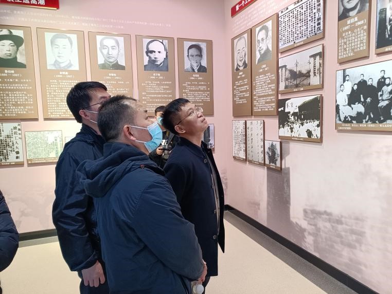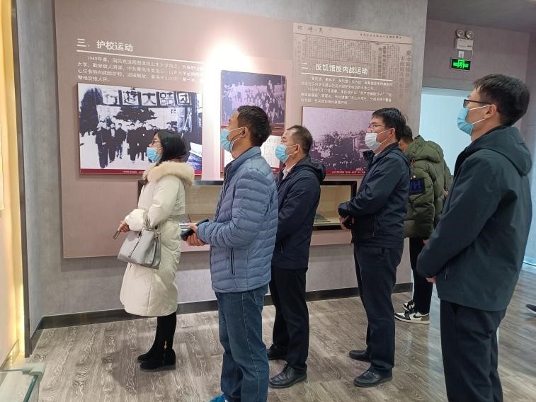 全体党员们参观了烈士事迹陈列馆东西两座,分列于中层平台的两侧。馆内陈列的烈士事迹和文物按历史时期分为5个部分。第一部分属第一次国内革命战争时期(1921~1927年),展出了中共一大代表王尽美和邓恩铭、中共青岛市委第二任书记李慰农、《青岛公民报》主笔胡信之等烈士事迹,反映了在建党初期,先烈们在青岛领导开展工人运动,举行罢工斗争的史迹。此外,还展出了日本帝国主义与反动军阀相互勾结镇压工人车工运动,制造屠杀工人的“青岛‘5·29’惨案”的史实。第二部分属第二次国内革命战争时期(1927~1937年),展出了在革命处于低潮时,徐子兴等烈士在青岛处决叛徒王复元斗争中的英勇事迹,以及罗石冰、王表山、郭隆真等12位烈士与国民党反动派作斗争的事迹。第三部分属抗日战争时期(1937~1945年),展出了周浩然、郑子扬、杜雨等烈士与日本侵略者英勇战斗的事迹。第四部分属解放战争时期(1945~1949年),展出了7位著名烈士在解放战争中的英雄事迹。第五部分,展出了解放以来在社会主义革命和社会主义建设中,为保卫祖国、捍卫和平而牺牲的27位烈士的感人事迹。