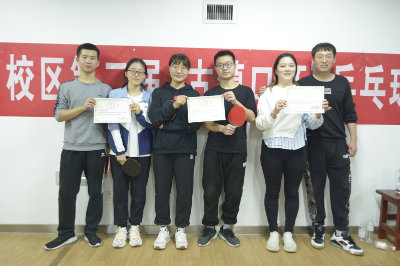 本次比赛设置男单、女单、男双和混双四个单项,各项目通过小组赛和淘汰赛决出胜负。赛前裁判组织参赛人员热身,随着裁判的一声哨响比赛开始。比赛中,选手们展现出高超的球技,扣杀、拉球、旋球,一个个精彩的防守和绝杀赢得了在场观众的欢呼喝彩。双打比赛中,选手间的默契配合和战术变化,将乒乓球的魅力发挥得淋漓尽致,场下观战的同学们也不时鼓掌,为正在比赛的选手们加油助威。裁判的认真负责、公平公正也保证了比赛的顺利进行。经过小组赛及淘汰赛的激烈角逐,最终周俊西、陈珊分别获得了男单、女单冠军,逄建鑫、徐高获得了男双冠军,混双冠军由陈珊、孙培翔获得。