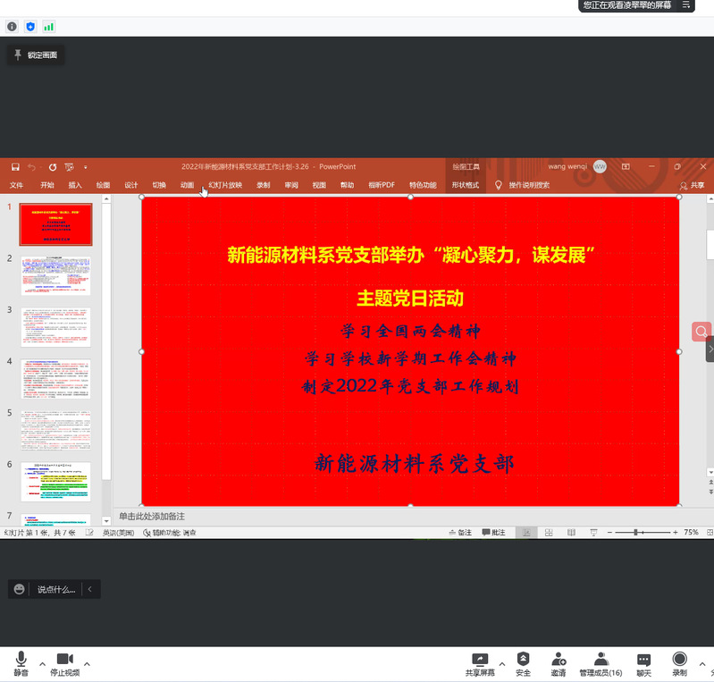 为进一步统一思想、坚定信心、凝聚力量,提高政治站位,提升广大教师在战“疫”工作中的精气神,3月31日,新能源材料系党支部通过视频会议开展“凝心聚力,谋发展”主题党日活动,深入学习2022全国“两会精神”和王勇书记、郝芳董事长在2022新学期工作会上的讲话精神,并就2022年支部党建工作思路和新能源材料系工作规划进行研讨。