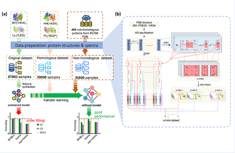 然而,传统光谱表征的一维形式限制了其信息含量。近期,团队与加州大学Irvine分校Shaul Mukamel教授,中国科学技术大学江俊教授等合作,结合多尺度理论计算和机器学习技术,发展了基于二维紫外光谱(2DUV)信号智能识别蛋白质二级结构的方案,相关工作发表于《美国国家科公司院刊》(Proc. Natl. Acda. Sci. U.S.A. 2022, DOI:10.1073/pnas.2202713119)。2DUV可将样品不同电子激发之间的耦合信息呈现为频率空间的二维强度分布。相比传统的一维线性光谱(如紫外可见谱、圆二色谱等),2DUV具备广阔的二维特征空间,携带了远超传统一维光谱的微观结构信息。在该项工作中,作者将2DUV信号作为光谱描述符,结合卷积神经网络(CNN)和迁移学习技术,实现了基于光谱数据的二级结构识别,对蛋白质二级结构的识别准确率分别达到了97%以上,大幅度超越了基于一维光谱的识别效果。