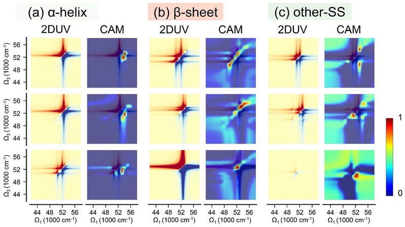 图 3不同二级结构的蛋白质片段的2DUV光谱(左)及对应的grad-CAM热图(右)。热图中红色表示较高权重,表示该部分光谱特征对结构识别过程具有更大贡献。