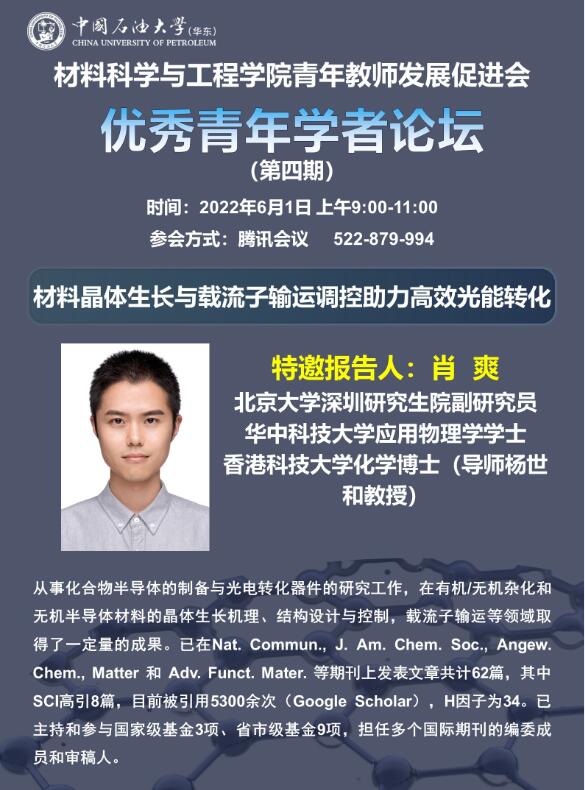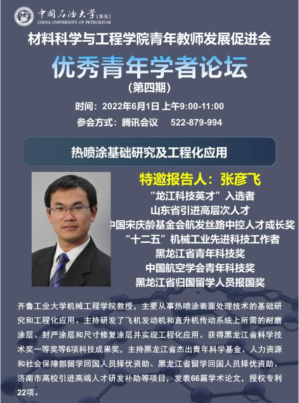 公司青年教师发展促进会将于6月1日(周三)上午举办“优秀青年学者论坛(第四期)”活动,我们有幸邀请了齐鲁工业大学张彦飞教授和北京大学深圳研究生院肖爽副研究员带来《热喷涂基础研究及工程化应用》、《材料晶体生长与载流子输运调控助力高效光能转化》的学术报告,欢迎各位老师和员工参会交流。