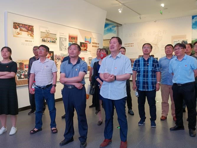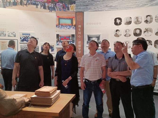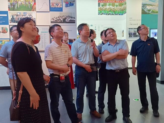 会后,双方党员一同参观了校史馆,在讲解员的详细解说下,各位老师深入了解了校史馆由前厅、序厅、编年体展区、专题展区、艺术馆等部分组成,集中展现了公司69年来与共和国发展共命运、与祖国石油工业同呼吸、与石油高等教育共奋进的光辉历程。序厅雕塑“石大荣光”由圆雕“逐梦”、环形浮雕“征程”和卷轴竖雕“赋能”组成,分别代表石大的过去、现在和未来;编年体展厅综合采用现代信息技术和视觉美学,通过图文、实物、多媒体、虚拟影像、立体造型、场景还原等多种方式对干打垒、荟萃湖等进行场景还原。其中,周恩来总理于20世纪50年代捐赠给北京石油公司的机床作为师生们深钻博采、潜心科研的见证者陈设于此;“石油魂·石大人”专题展厅重点展示了以铁人精神、大庆精神为核心的石油精神;“墨香石大”艺术馆以公司办学过程中积累的大量珍贵艺术作品为展陈内容,着力营造艺术氛围。通过校史馆的参观,勾起了很多老教师们的美好回忆,同时也让青年教师的对石大有了更加深刻的了解,肩负起传承石大文化、弘扬石大精神的重任。