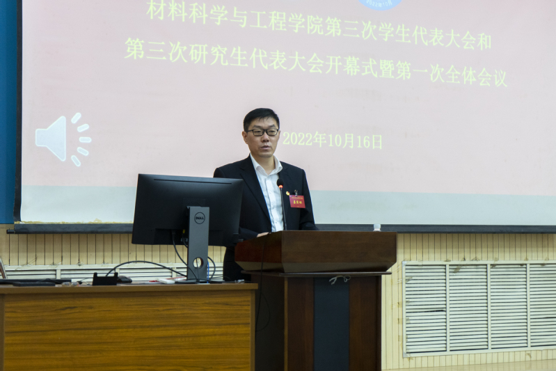 大会在雄壮的国歌声中拉开序幕。刘军赫、李宇航分别代表校员工会、校研究生会致辞,对大会的顺利召开表示热烈祝贺与美好祝愿,肯定了材料公司积极开展的“创材者计划”、权益月刊等员工工作,希望材料公司员工会与研究生会继续发挥桥梁和纽带作用,着眼现在,展望未来,为校院联动开启新篇章。