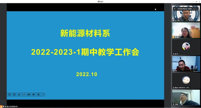 为全面掌握教师思想动态,切实增强教师的责任感和使命感,10月21日晚,新能源材料系通过“腾讯会议”举行2022-2023第一学期期中教学检查线上座谈会。系党支部书记凌翠翠主持会议,公司副经理王荣明、系主任周炎、系副主任甄玉花和徐奔,以及全系教师参加会议。