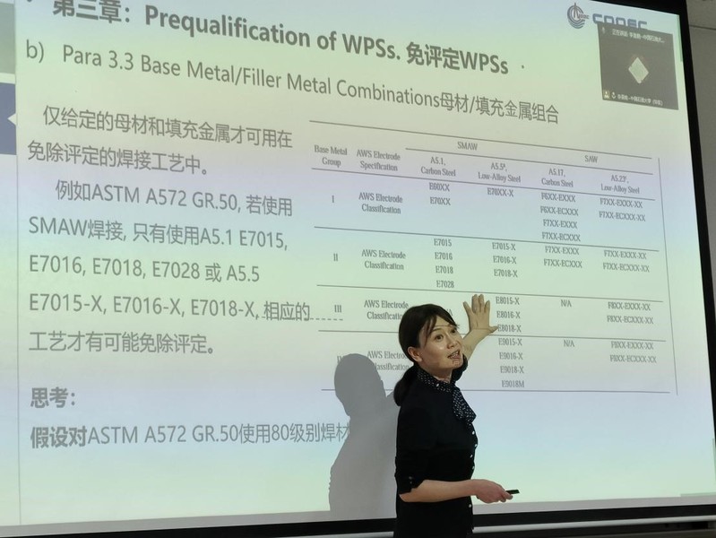 程晋宜首先介绍了海洋石油工程(青岛)有限公司基本概况,详细介绍了近几年海工建设大型装备特点、应用环境、服务国家能源战略所起到的关键性作用,着重讲述了大国重器制造过程中焊接技术的角色和重要作用;介绍了海洋结构建造过程中对材料、焊接工艺、力学性能的要求,重点讲述了AWS D1.1标准特点、组成部分、应用背景等,讲述了标准中免评定WPSs具体内容和要求等;结合现场实际情况介绍了AWS标准中规定的力学性能测试方法、海洋工程常用的无损检测方法及适用范围等。报告内容丰富,课堂气氛活跃,师生互动热烈,理论联系实际,让员工对焊接工程有了更加深入的理解。程晋宜书记重点阐释了焊接标准在工程应用中的重要性,强调作为未来的焊接工程师一定要具备良好的职业素养。并结合个人工作经历和管理经验,分享了焊接工程师的职业发展、个人规划、能力要求等方面的心得体会,鼓励即将毕业的材控专业员工热爱自己的专业,培养良好的职业素养、不怕吃苦的精神、干事创业的决心,将来能在焊接工程领域成就一番事业。