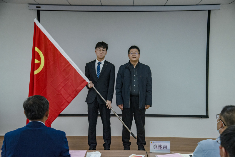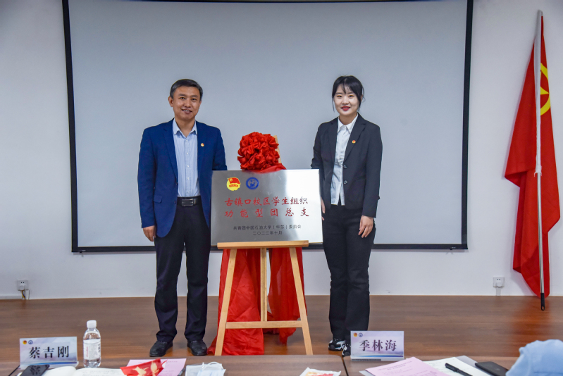 蔡吉刚与古镇口校区员工组织功能型团总支负责人李娇同学共同为“古镇口校区员工组织功能型团总支”揭牌。随后,周世光向团总支授团旗,并由石大山能新能源公司主席团成员陶志雄同学接旗。