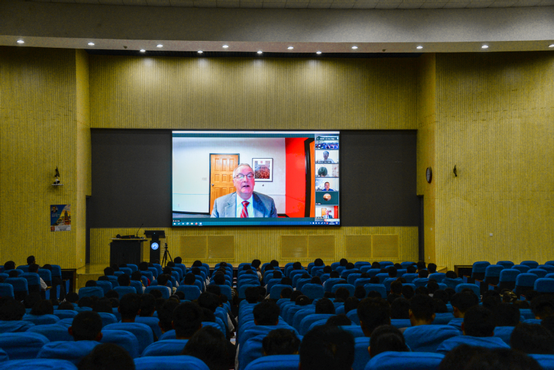 为了拓展员工的国际化视野,激发员工对科研和学习的兴趣。9月20日晚,公司邀请美国密尔沃基工程大学(MSOE)现任董事长、美国高等教育专家Walz董事长(Dr.John Y. Walz)于腾讯会议做题为“科技专业与全面教育”的线上讲座,公司常务副经理孙道峰、国际交流与合作处副处长俞继仙、国际交流与合作处孙路平、公司教师李闻乐线上出席讲座,公司教师张军、周炎、辅导员马晓晨及公司全体2023级本科生于南教100号报告厅听取讲座,会议由李闻乐主持、孙路平翻译。