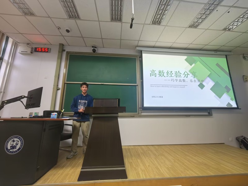 邢昊原为材料类2301-2303班的同学进行了分享。他从课前预习、课后巩固、考前复习三个方面分享了自己的学习经验,并指出:学习高数不能仅仅停留在课本知识上,更要注重运用和思考。