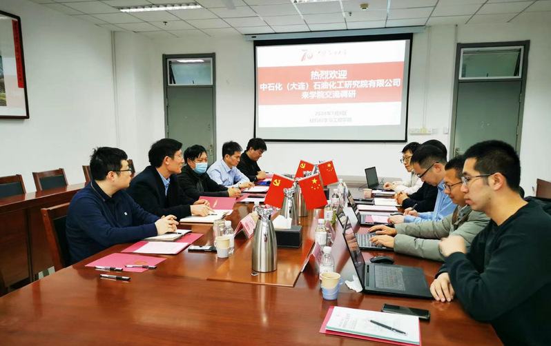 1月9日,中石化(大连)石油化工研究院有限公司十二研究室支部书记李遵照、集团公司高级专家孙乾耀等一行五人来公司交流技术合作事宜。材料公司经理吴传德、党委书记门小刚等公司班子成员和相关专家代表参加了座谈交流和技术对接。座谈会由门小刚主持。