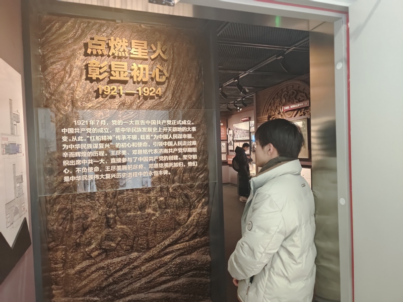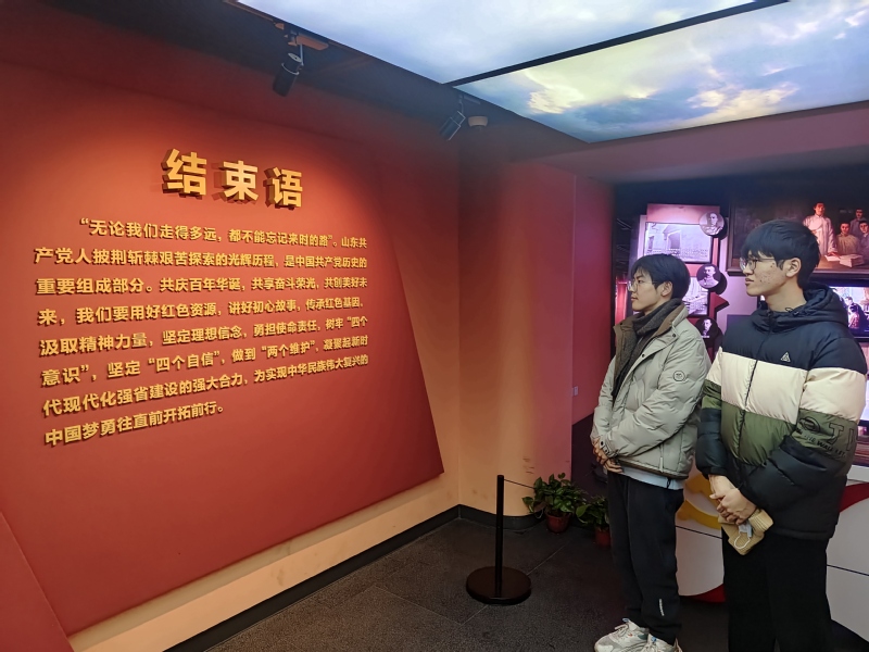 在纪念馆中,生云昊、马恩煜通过参观党史故事壁画,观看文献等了解到了中国共产党的建立以及济南党组织发展的壮大历程。“马克思主义在中国的广泛传播和一批确立了马克思主义信仰的先进分子的出现,1921年中国共产党应运而生”,随着队员们不断前行,一块块红色标识牌映入眼帘。随后生云昊和马恩煜进入主展厅,沿着中国共产党的历史脚步,了解学习了中国共产党的关键历史节点。在主展厅,队员们通过询问工作人员得知:从王尽美、邓恩铭出席远东会议,到王尽美创建津浦铁路大槐树机厂工会,从济南团组织的建立到王尽美任中共济南地执委书记。济南党组织一步一个脚印逐渐发展壮大,王尽美和邓恩铭代表济南共产党早期组织直接参与了中国共产党的创建,是中华民族伟大复兴历史进程的永恒丰碑。“无论我们走得多远,都不能忘记来时的路,不能忘记先辈们艰苦奋斗的时光,不能忘记那些弥足珍贵的红色精神”,参观结束后,赤华队队员马恩煜、生云昊感慨道。
