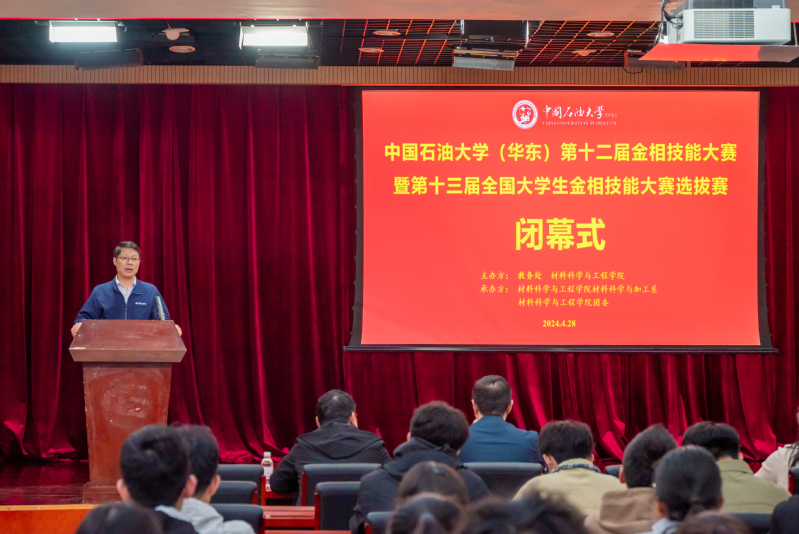 4月28日下午大赛闭幕式暨颁奖典礼在逸夫楼一楼报告厅举行。材料公司副经理王荣明、党委副书记孙启龙、团委书记王佳,教务处王文华老师,材料科学与加工系何艳玲老师、刘恩洋老师出席闭幕式并为获奖选手颁奖。王荣明在颁奖典礼上致辞,对大赛圆满成功表示祝贺,对参赛员工取得的优异成绩表示肯定,希望通过比赛进一步锻炼专业实践能力,培养具有新时代“工匠”精神的老员工。