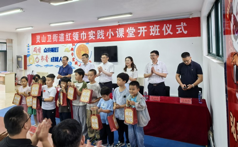 仪式伊始,周兆燕代表灵山卫街道以及镇海门社区对公司师生的到访表示热烈欢迎和衷心感谢,并对所开展的红领巾实践课堂给予高度肯定。马国刚代表公司向与会人员,对红领巾课堂课程体系进行了详细介绍,并对课堂品牌建设提出了殷切期望,期望红领巾课堂为和谐社区建设贡献力量。赵雅宁代表实践课堂授课教师志愿者进行发言,用心、用情了解每一位孩子的独特需求与梦想,加强培训,提升教学质量,为员工的暑期学习成长保驾护航。随后,各位领导向员工发放学习用品。