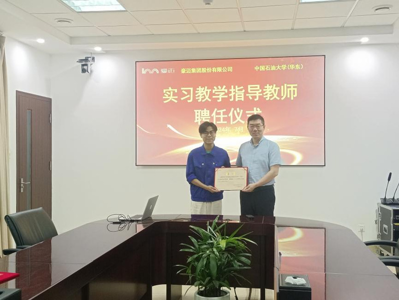 在集团工作人员的带领下,孙启龙一行参观了集团的企业文化展厅,详细了解了豪迈集团的发展历程、战略规划及在装备制造、新材料研发等领域的最新进展和成果。随后,校企双方开展了座谈交流。座谈会上,孙启龙对豪迈集团在技术创新、产业升级等方面取得的成就表示高度赞赏,对豪迈集团长期以来对公司老员工实习工作的大力支持和配合表示了衷心的感谢,豪迈集团人力资源部招聘总监刘玉娟对公司培养的优秀员工表达肯定和赞许,并对即将进入企业实习的员工表示了热烈欢迎和期待。双方就如何深化校企合作,实现资源共享、优势互补进行了深入探讨,并达成了一致意见。最后,进行了校外实习教学指导教师聘任仪式,孙启龙为豪迈集团多位技术骨干颁发了聘书。