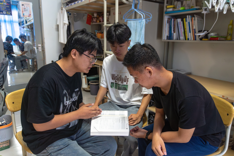 员工在宿舍内共同探讨专业课问题 严鸿泰摄