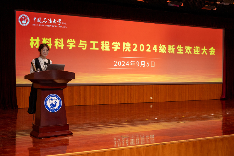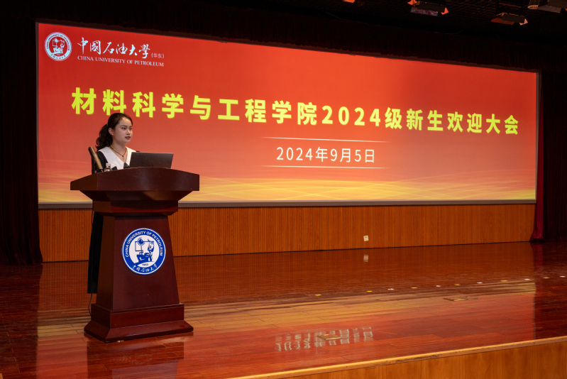 材料类2411班的徐凯琪代表本科生新生发言,表达了内心对石大的憧憬与尊敬,并承诺将以青春的激情和不懈的努力积极践行“家国同心,艰苦奋斗,惟真惟实,追求卓越”的石大精神,为成为一名杰出优秀的石大学子、成为一名追求卓越的材料人而不懈奋斗!