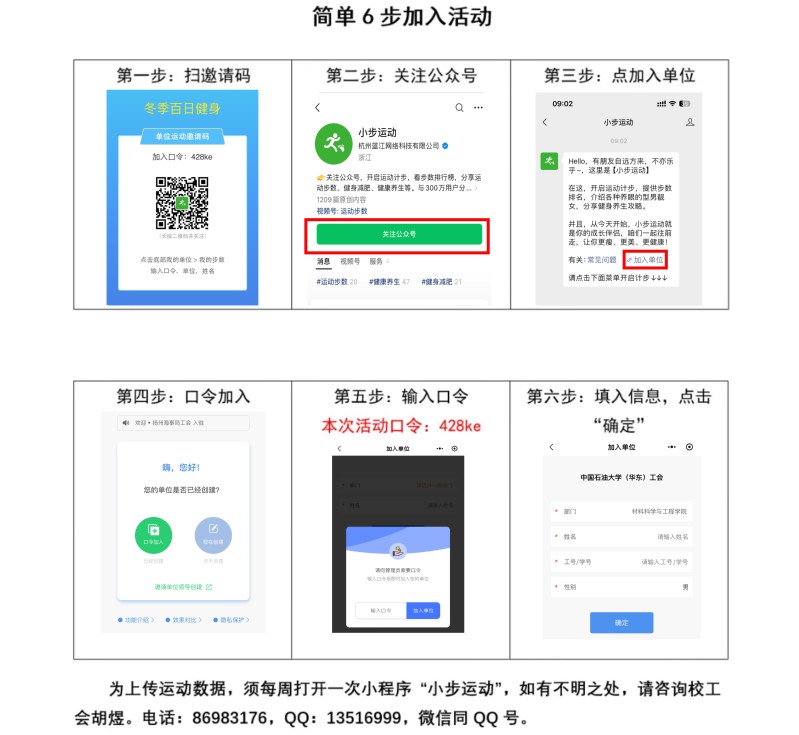 参与方式:关注微信公众号“小步运动”,按要求选择所属院级工会,填写真实姓名、工号(具体步骤如下)。注册成功后,通过微信小程序完成每天运动打卡,每天5000步以上、累积锻炼超过60天者,可获得纪念品。