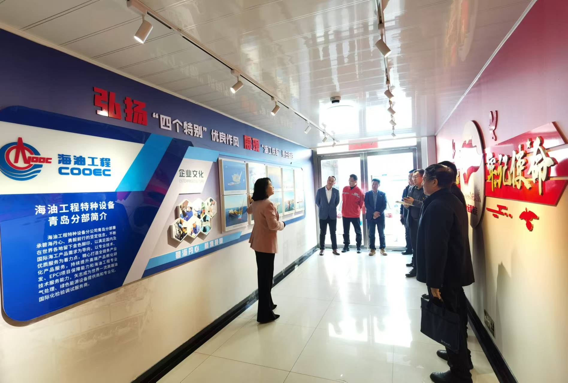 活动伊始,一行人首先参观了海油工程特种设备分公司青岛分部党支部的党建阵地、历史长廊、企业展厅、职工之家、实验室及青岛场地,深入了解海油发展史、青岛分部的典型项目以及典型人物的先进事迹。这些丰富的党建内容和企业文化,不仅展示了海油工程的辉煌成就,也彰显了青岛分部党支部在党建工作中的卓越贡献。随后,三方围绕党建经验进行了深入的交流与分享。一致认为,加强党支部之间的交流与学习,不仅能够促进人才、科技与生产的深度融合,更是贯彻“科研成果写在祖国大地上”理念、推动科研成果在生产单位落地转化的重要途径。同时,党建交流活动还为三方提供了宝贵的合作契机,有助于打通科技创新工作的“最后一公里”,为校企合作注入新的活力。