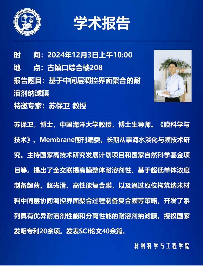 【学术报告预告】基于中间层调控界面聚合的耐溶剂纳滤膜