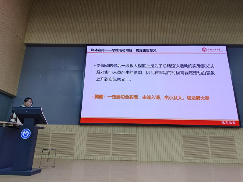 随后,赵雅宁对社会实践的申报流程、学时认定、成果转化等方面进行介绍,重点强调社会实践过程中宣传工作的重要性,并向同学们分享了新闻撰写的方法技巧及相关投稿渠道和方法,鼓励同学们多读多写,把宣传工作做到位。