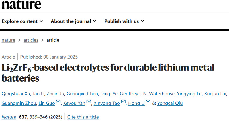 据悉,严克友教授团队针对锂金属负极在碳酸酯电解液的界面稳定性难题,通过创新性地利用单斜相m-Li2ZrF6纳米颗粒作为添加剂,成功在锂金属负极表面构建了具有优异电化学性能的基于三方相t-Li2ZrF6固态电解质界面,这一突破性技术实现了锂金属电池在高载量、低N/P值和超高倍率下的稳定循环,能够在2C的倍率下循环3000次后依然保持80%的容量,达到了同级别研究的最高水平。此外,m-Li2ZrF6纳米颗粒的合成工艺简单,具备大规模生产条件,为锂金属电池的广泛应用提供了切实可行的解决方案。研究成果以“Li2ZrF6 based electrolytes for durable lithium metal batteries”为题,发表在国际顶尖学术期刊Nature上。