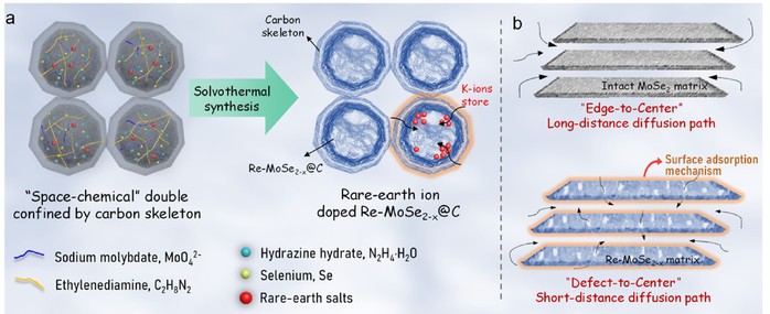 由于钾离子在Se-M-Se片层结构中插入和传输需要克服一定的能垒,目前MSe2材料通常表现出缓慢的反应动力学,实现高效的“插层-转化”反应仍然存在很大的挑战。实际上,被忽视的由表面吸附控制的电容型工作机制,是具有实现碱金属离子快速储存潜力的,但这需要MSe2材料尽可能多地暴露Se-M-Se基面。为了实现这一目标,本文开发了稀土离子诱导预激发策略,一系列稀土离子(Re=Lu3+,Tm3+,Y3+,Gd3+,Sm3+,Nd3+和La3+)被引入Se-Mo-Se基面上,以产生丰富的表面活性位点。稀土离子具有合适的离子半径和独特的核外电子结构,可以很容易地取代Se或Mo原子,在Se-Mo-Se基面上留下高达14.2%的Se空位。因此,钾离子可以优先吸附在表面空位上。随后,这些被吸附的钾离子穿过Se-Mo-Se基面从缺陷位点而不是边缘,完成随后的“插层-转化”反应。由于这种集成的工作机制,组装的钾离子电池和钾离子电容器提供了卓越的钾离子存储能力。该工作以题为“Rare-earth ions induced pre-excitation of intercalation-conversion anode to achieve fast potassium-ion storage”发表在 Energy Storage Materials上,论文第一作者为崔永朋副教授,通讯作者为崔永朋副教授、邢伟教授和唐永福教授,通讯单位为中国石油大学(北京)、全球最大顶级体育平台和燕山大学。