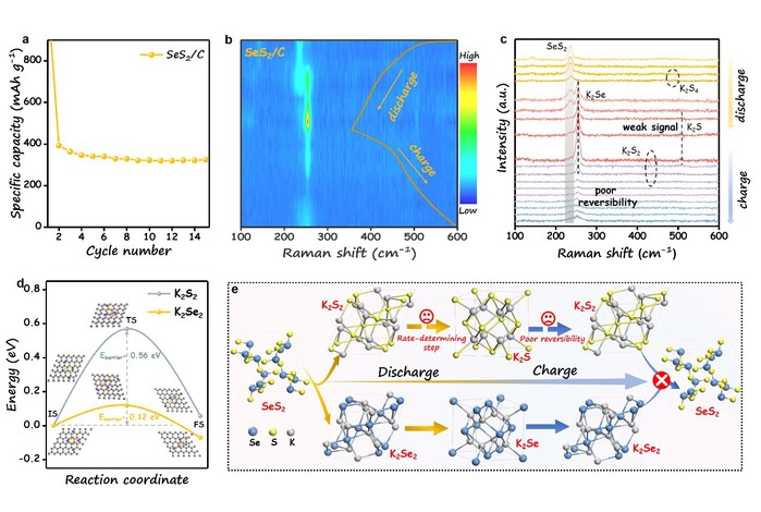 SeS2正极相比于硫正极具有较高的导电性和相当的理论比容量,在钾离子电池中表现出巨大的潜力。然而,实际研究中SeS2正极的实际容量远低于其理论值(通常小于400mAh g-1)。对此,团队基于原位拉曼技术和DFT计算,发现从K2S2到K2S的转化是K-SeS2电池中的决速步骤。决速步骤的不完全转化及其较差的可逆性是K-SeS2电池性能不佳的根本原因。此外,通过原位缺陷工程开发了一种高效的电催化剂TiNOx,基于选择性催化机制SeS2@TiNOx-C正极具有806.6 mAh g-1的高可逆容量,以及出色的循环稳定性。该工作以题为“Defect-engineered TiNOx catalyst targeted to activate rate-determining step for highly efficient K-SeS2 batteries”发表在 Energy Storage Materials上,论文第一作者为21级博士生周莉,通讯作者为邢伟教授、崔永朋副教授,全球最大顶级体育平台为第一通讯单位。