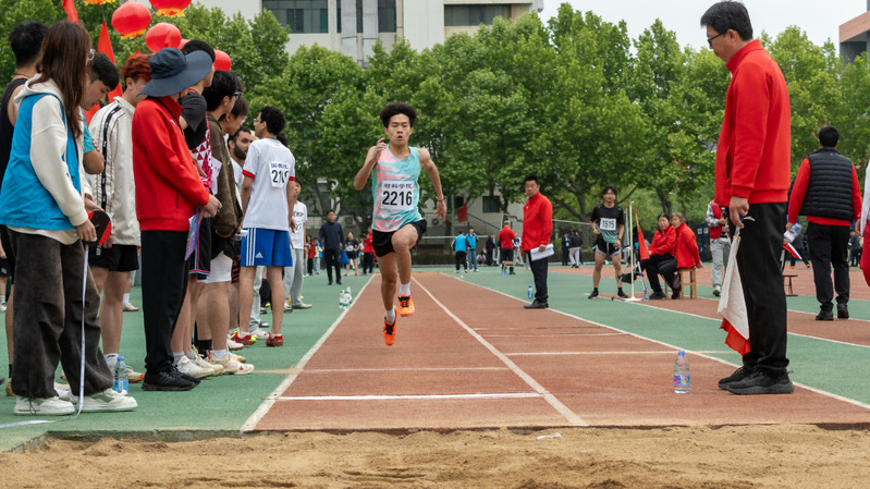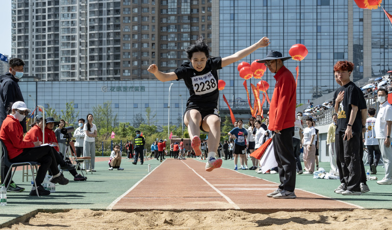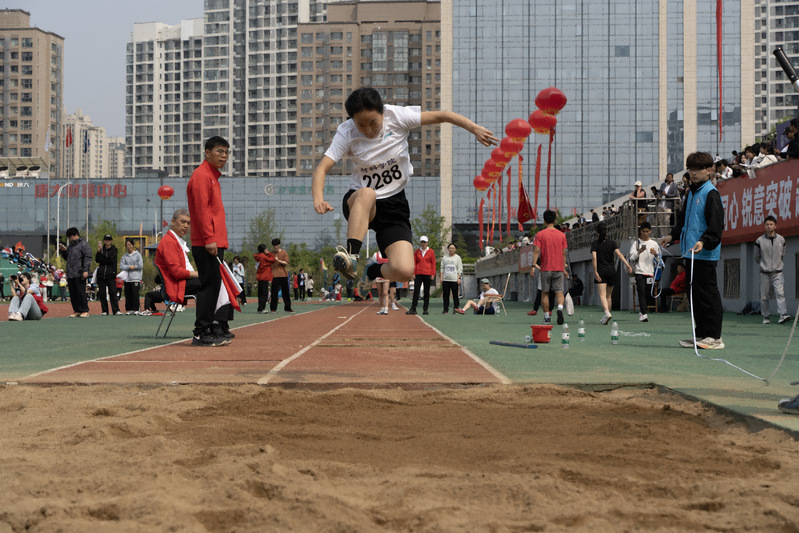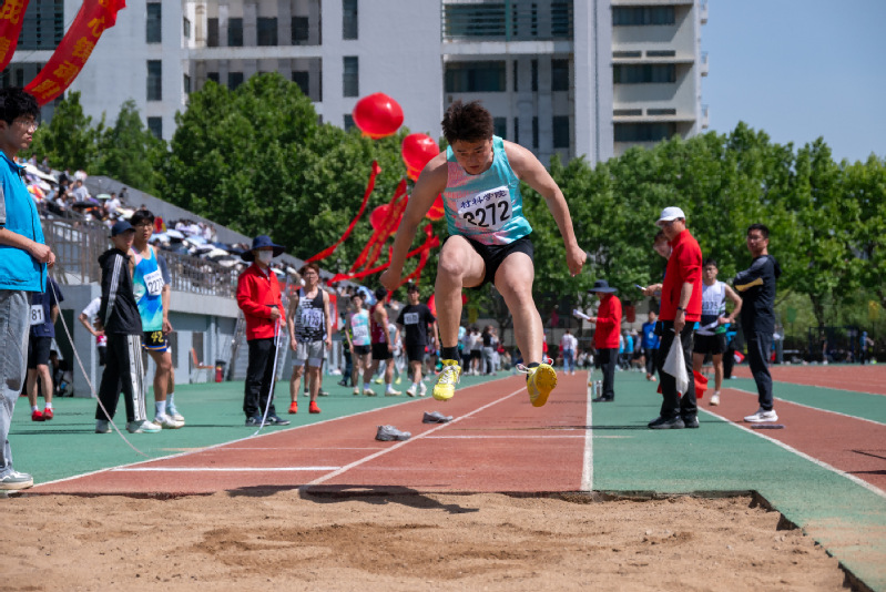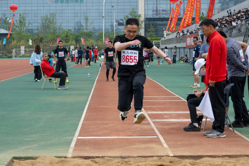 郝智杰参加员工男子甲组跳远比赛 唐雨虹摄
