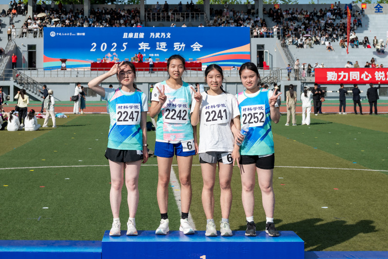 帅语彤、董晏菲、霍文静、徐凯琪员工女子甲组4x100米接力合影 赵晨阳摄
