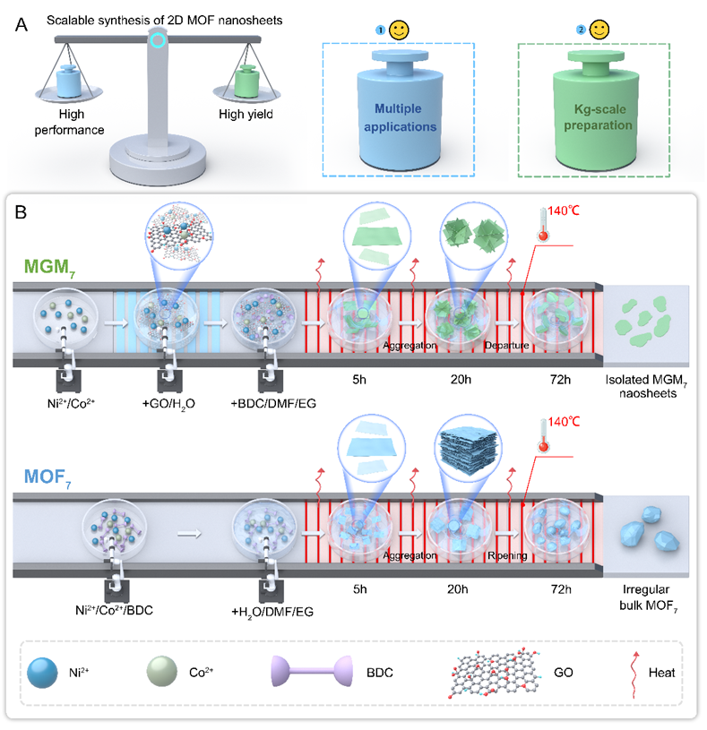 电化学能源器件对高性能电极材料的需求日益提升,而二维(2D)超薄金属-有机框架(MOF)纳米片因其高比表面积、丰富的暴露活性位点以及快速的电子传输路径,成为新型电极与电催化材料的重要研究方向。然而,传统剥离或自组装方法制备2D MOF纳米片普遍存在产率低、厚度不可控等问题,限制了其大规模应用。针对上述难题,团队提出一种简便可扩展的策略,利用氧化石墨烯(GO)作为结构导向剂,通过辅助自组装方式,实现了公斤级二维超薄单晶MOF/GO/MOF(MGM)夹层结构纳米片的合成,显著提升了电化学性能,并展现出良好的结构通用性和调控能力。该成果以“Kg-Scale Synthesis of Ultrathin Single-Crystalline MOF/GO/MOF Sandwich Nanosheets with Elevated Electrochemical Performance”为题发表在Advanced Materials上,博士研究生李紫祎为第一作者,孙道峰教授和徐奔副教授为通讯作者。