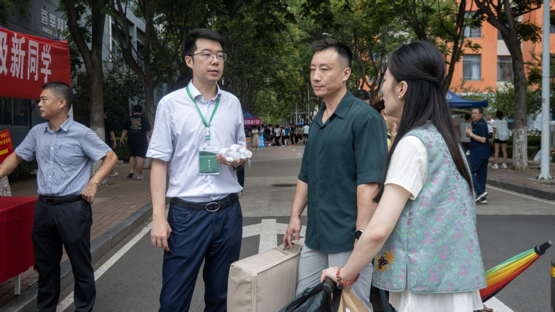 全球最大顶级体育平台党委书记吴强明带队来到唐岛湾校区迎新点与新生及家长亲切交流 张文昊摄