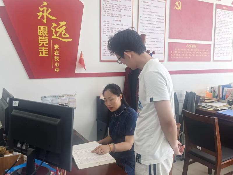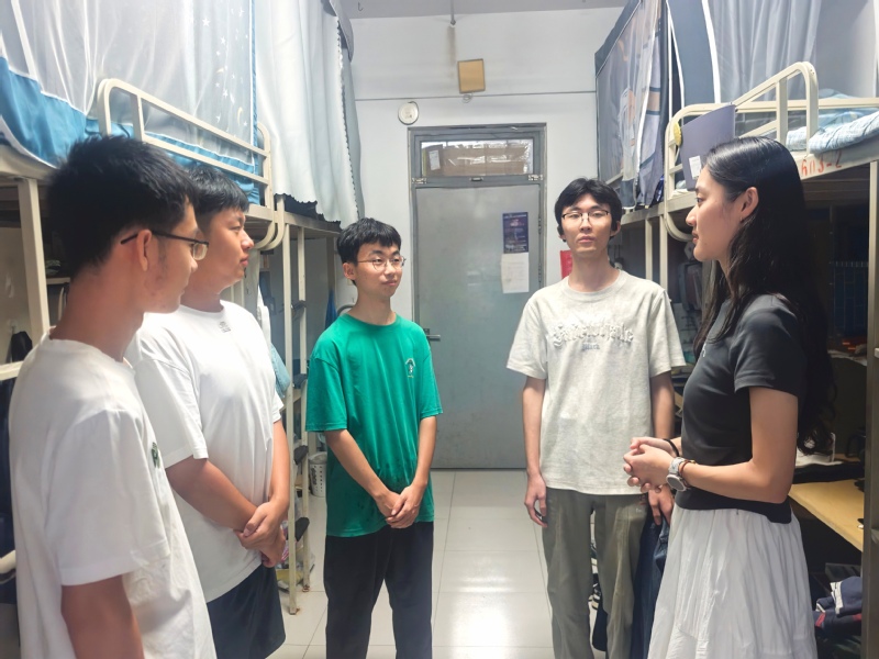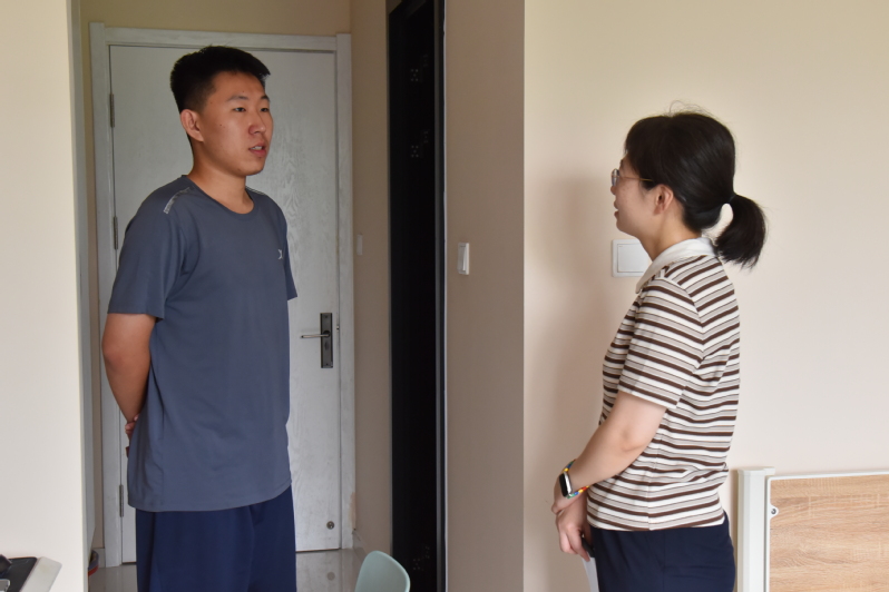 辅导员王佳在古镇口校区研究生宿舍与新生交谈
