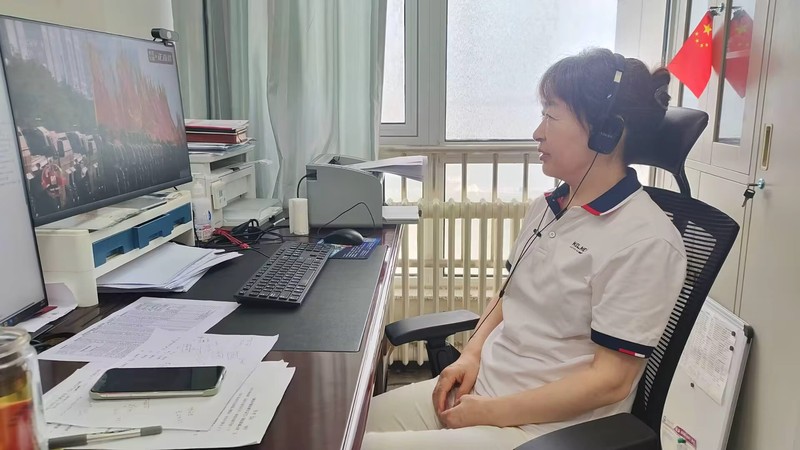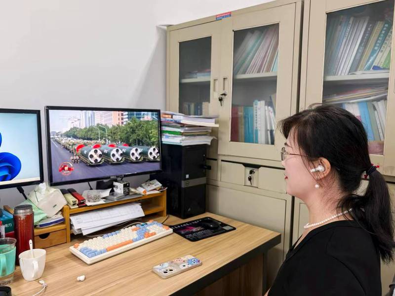 李美艳副教授在办公室观看纪念大会 赵卫民摄