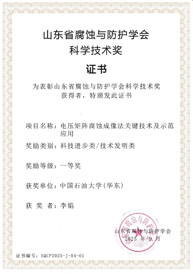 近期,公司李焰教授团队在智能腐蚀监测领域取得一系列重要进展。通过为期十年的自主创新研究和产学研深度协作,团队逐步攻克电压矩阵成像法腐蚀监测技术在国内石油、化工行业应用的瓶颈,研发成功了具有自主知识产权的智能腐蚀监测与评估成套技术及装备,并连续获得2024年度中国石油和化工自动化行业专利奖优秀奖、2024年NI(美国国家仪器公司)全国用户案例与创意大赛优秀价值奖和2025年山东省腐蚀与防护学会科学技术奖一等奖等奖励,这标志着材料公司在能源装备腐蚀控制领域的发展过程中又迈出坚实一步。